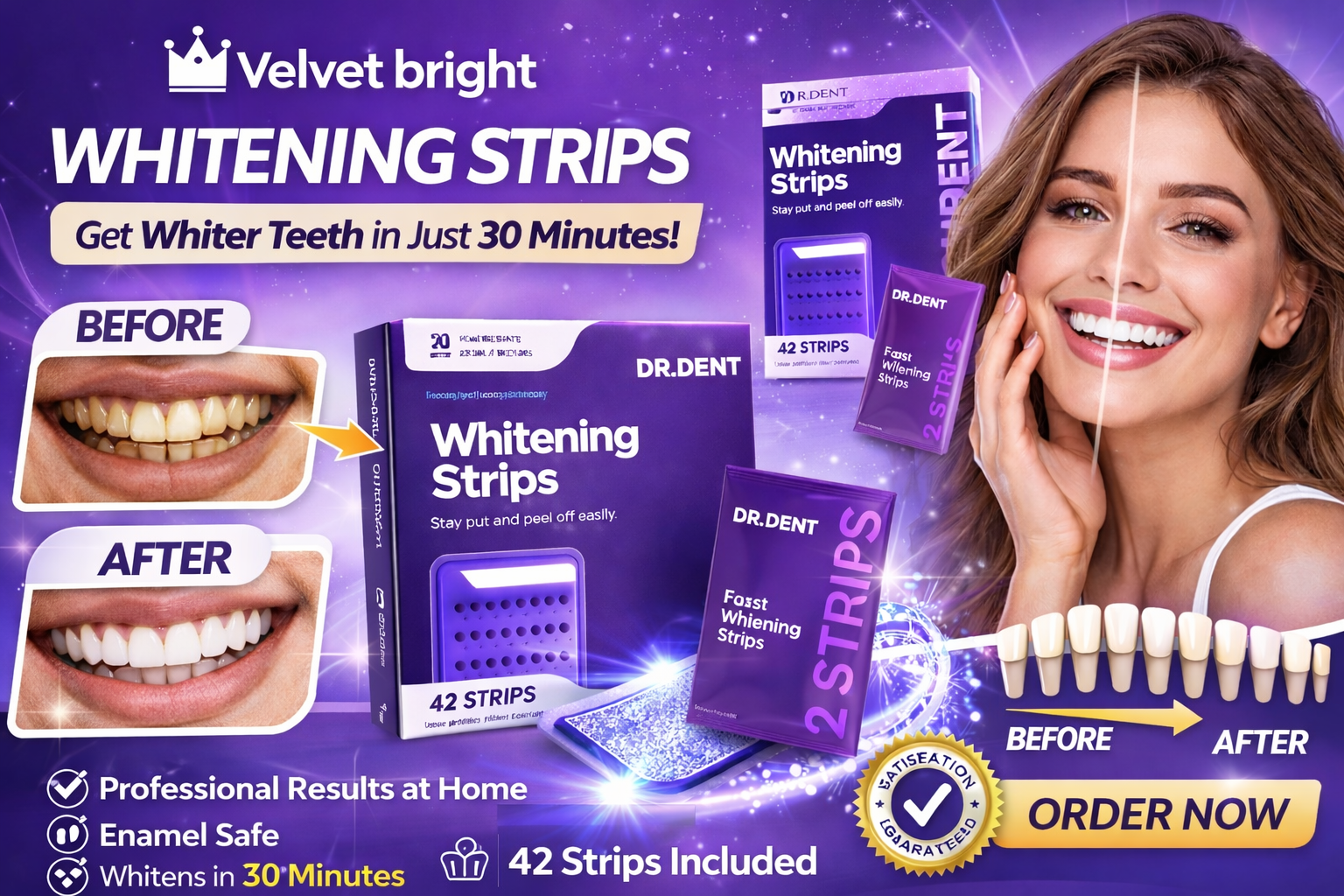 Our advanced whitening strips are designed to deliver fast, safe, and noticeable results while staying gentle on your enamel. Compare the difference and discover why more people are choosing Velvet Bright for a brighter smile.